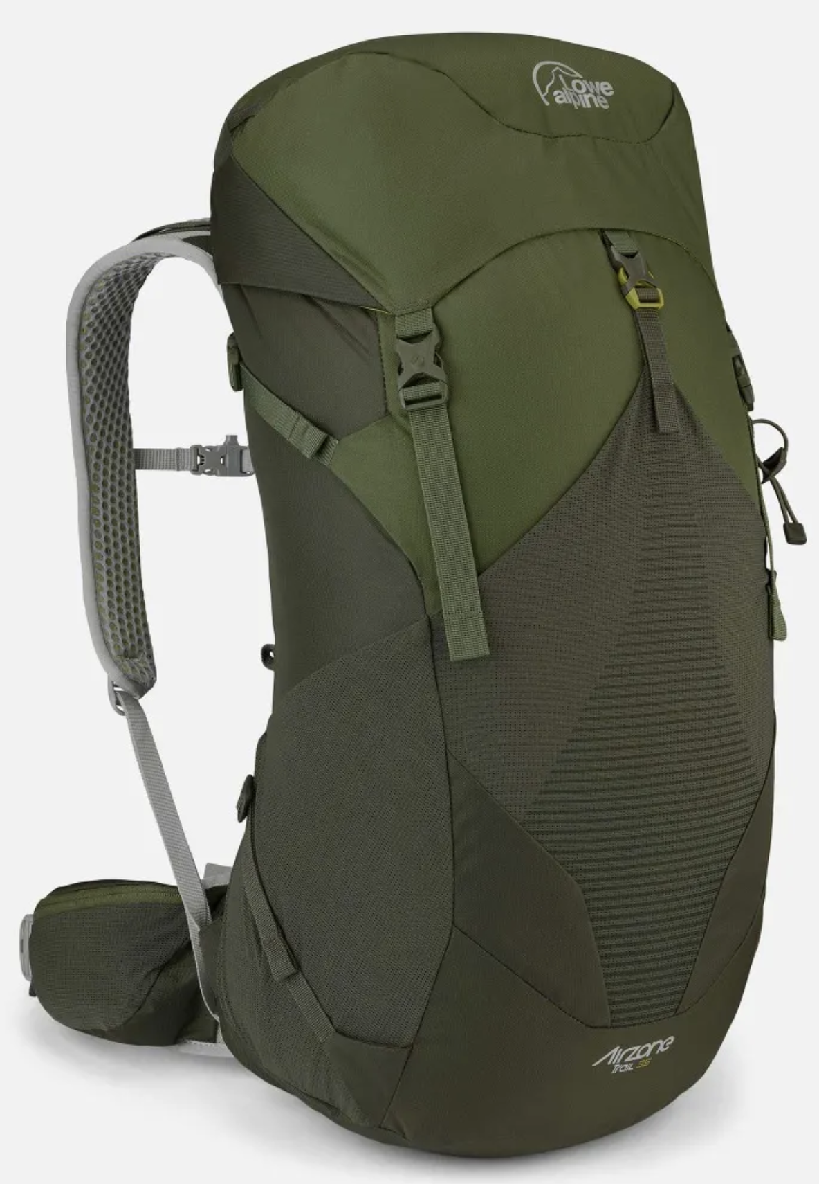 Lowe Alpine AirZone Trail 35L – fixed AirZone harness with a ventilated breathable back, forward pull hipbelt system, expendable side pockets, zipped lid pocket and a front stash pocket, hydration compatible.